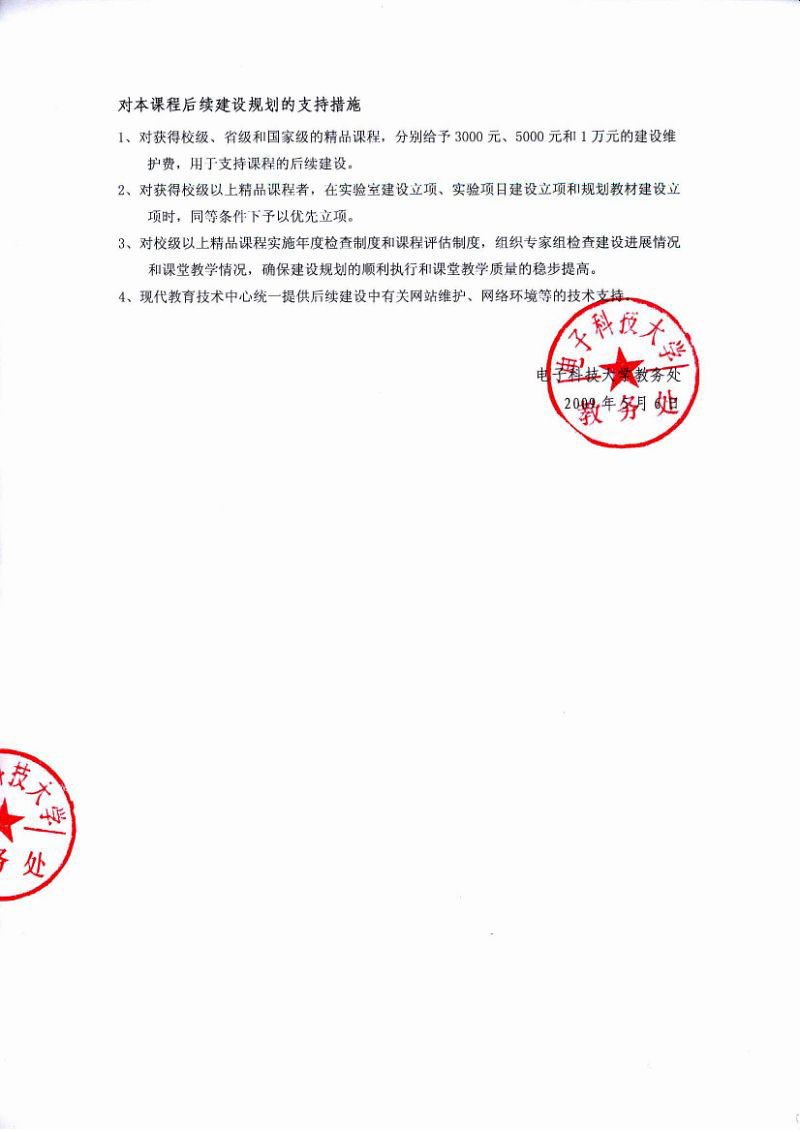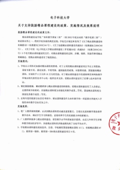 精品课程建设是学校“本科教学质量工程”(原2002年底启动的“教学优质工程”)的重要内容之一,得到学校各级的高度重视。学校先后制定和发布了《关于精品课程建设的实施意见》(校教意见[2002]64号)、《关于加强精品课程建设的通知》(校教通知[2004]48号)、《关于印发〈电子科技大学精品课程建设工作实施办法〉的通知》(校教[2004]161号)3个有关精品课程建设的文件,对精品课程建设的过程、步骤、保障、奖励等事项做出明确规定,使精品课程建设有了制度保证。