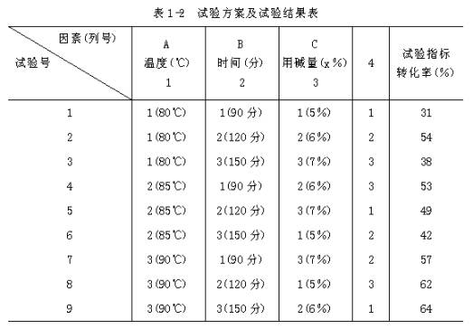 试验目的是搞清楚因素A、B、C对转化率的影响,哪些是主要因素,哪些是次要因素,从而确定最优生产条件,即温度、时间及用碱量各为多少才能使转化率提高。