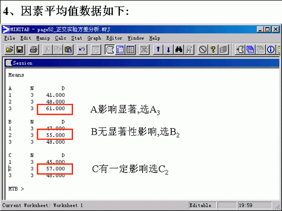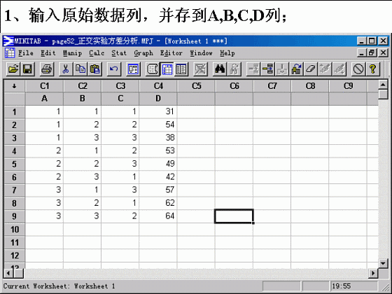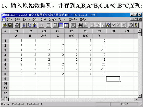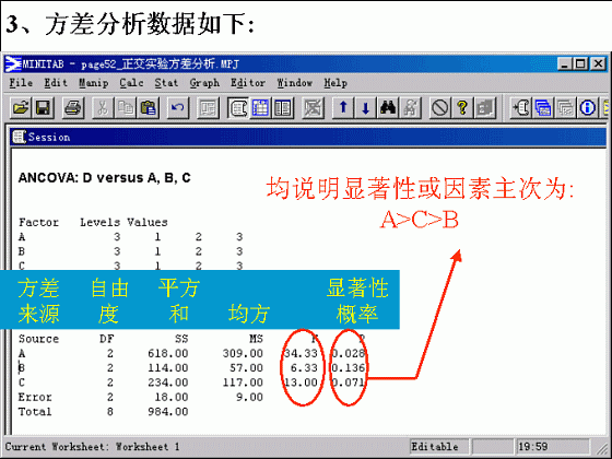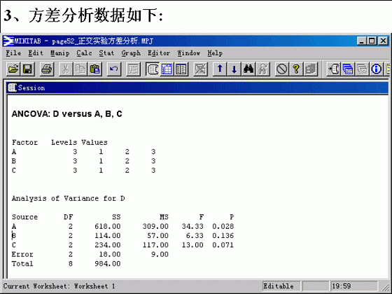 这是一个常见的正交试验,我们可以minitab对实验结果进行方差分析。具体操作过程如下: