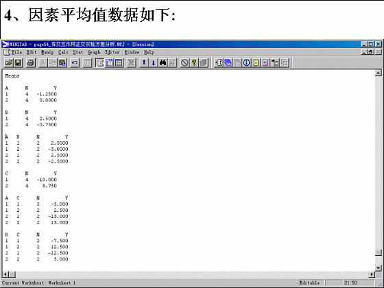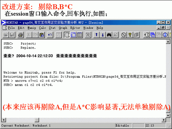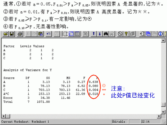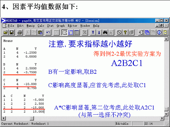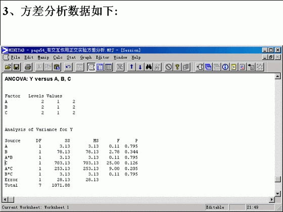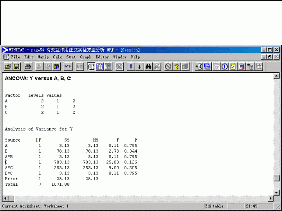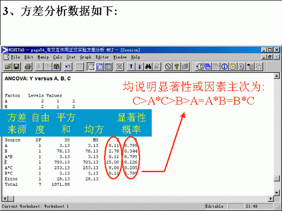 这是一个带交互作用的正交试验,我们可以minitab对实验结果进行方差分析。具体操作过程如下