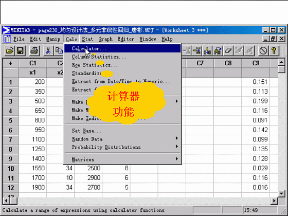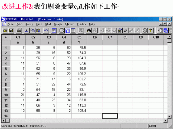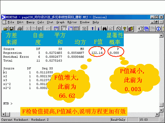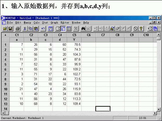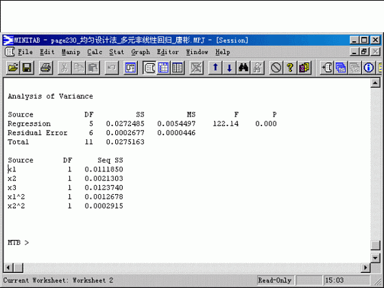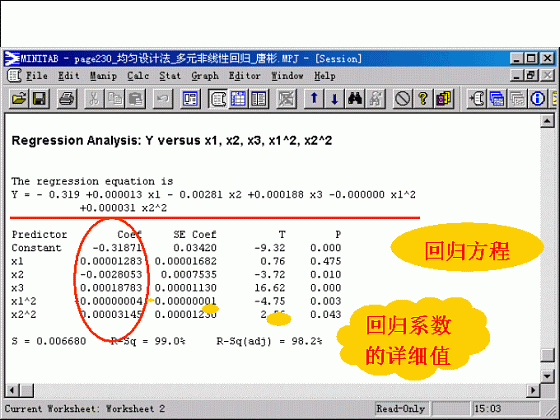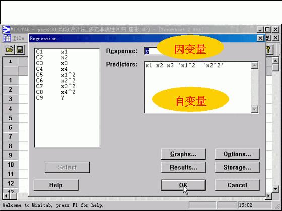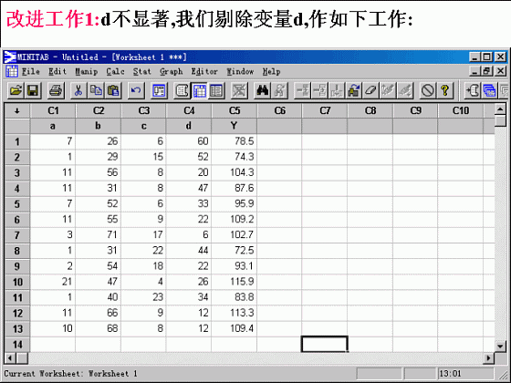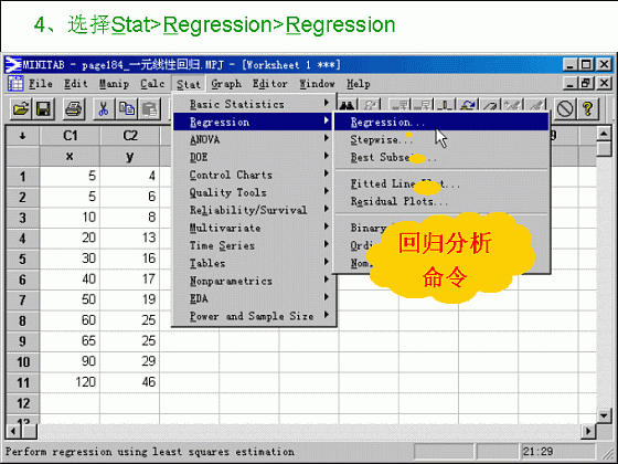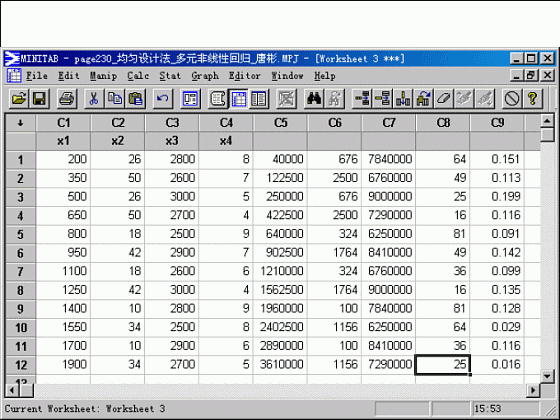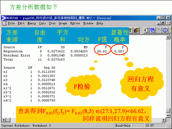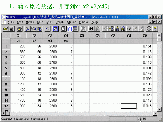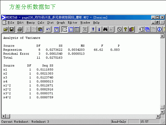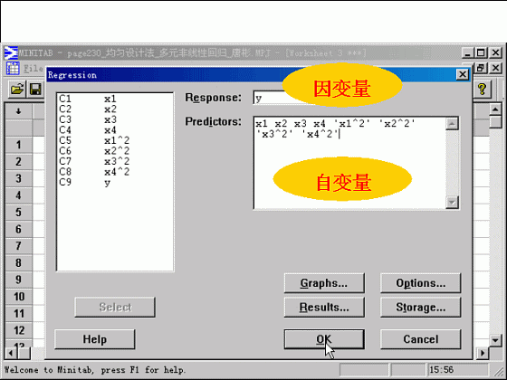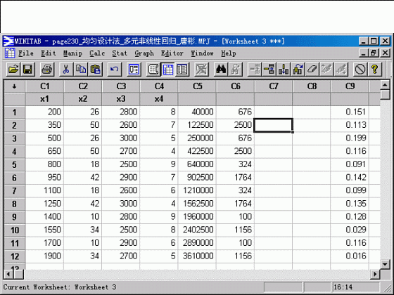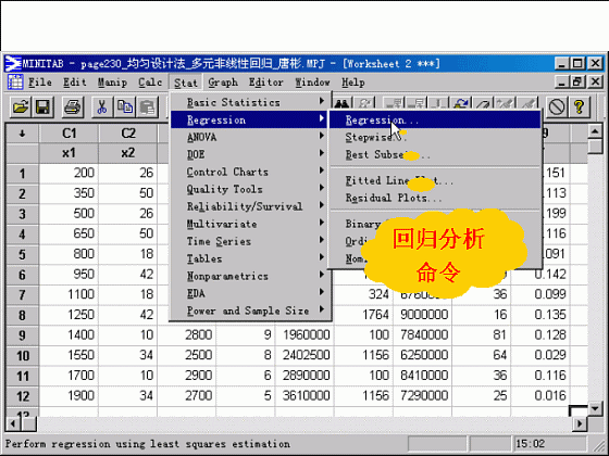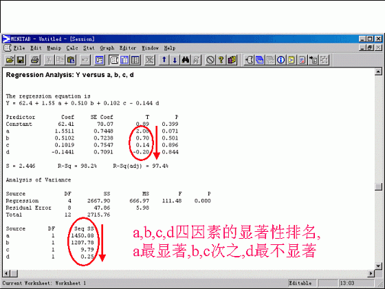 这是一个多元线性回归问题,具有4个一元变量,我们可以用minitab来得到回归方程并分析结果,具体操作步骤如下: